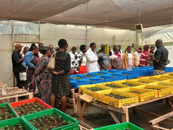 A farmer group visiting Rukaria Nursery to observe apical-rooted cutting production and management techniques.