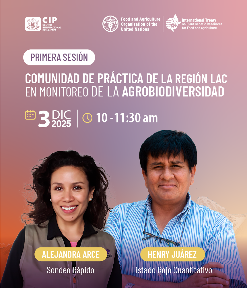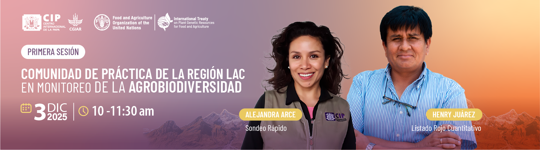 El Centro Internacional de la Papa (CIP) invita cordialmente a participar en la primera sesión de la Comunidad de Práctica en Monitoreo de la Agrobiodiversidad (CdP-LAC), que se realizará el miércoles 3 de diciembre, de 10:00 a 11:30 a.m. Este encuentro reúne a especialistas e instituciones de la región con el fin de fortalecer capacidades y promover enfoques comunes para el seguimiento y la conservación de la agrobiodiversidad.