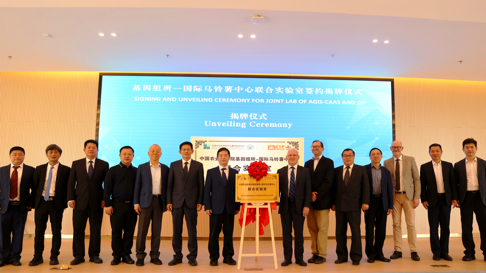 The laboratory was jointly inaugurated by Huang Sanwen, President of CAAS and Member of the Chinese Academy of Sciences; Simon Heck, Director General of CIP; Hugo Campos, Deputy Director General of CIP; Xie Jianmin, Director of CCCAP; Wang Guirong, Director of AGIS; and Tong Jixu, Deputy Director of AGIS. The cooperation agreement was officially signed by Simon Heck and Wang Guirong.